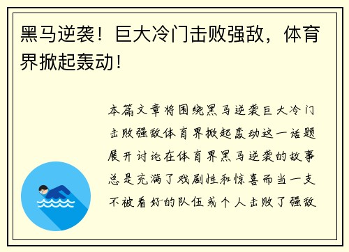 在体育赛事中,总有一些小众球队以黑马姿态逆袭,战胜强敌,最终斩获冠军。这种逆袭不仅令人振奋,也让人感受到体育竞技中“没有不可能”的信念。这类黑马崛起的故事,无论是体现在足球、篮球,还是其他项目中,都充满了戏剧性和不可预测性。本文将从四个方面详细阐述这类小众球队如何逆袭大热门,震惊赛场并最终斩获冠军荣耀:一是黑马崛起的原因,二是战术策略的成功,三是团队的凝聚力与发挥,四是偶然与必然的巧妙结合。通过这...
