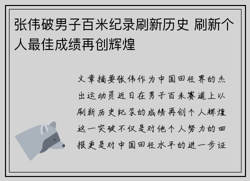 近年来,中国体育在国际赛场上屡屡传来佳绩,尤其是在田径项目上,取得了令人瞩目的突破。尤其是在短跑项目中,中国选手屡屡刷新自己的成绩,逐渐跻身世界强队之列。近期,一名中国短跑选手成功打破百米世界纪录,创造了新的世界最快成绩,引起了全球田径界的广泛关注。这不仅是中国体育的伟大突破,也是世界田径历史上的一大里程碑。本文将从四个方面深入探讨中国短跑选手如何打破百米纪录,创下新的世界最快成绩,分析其背后的原...